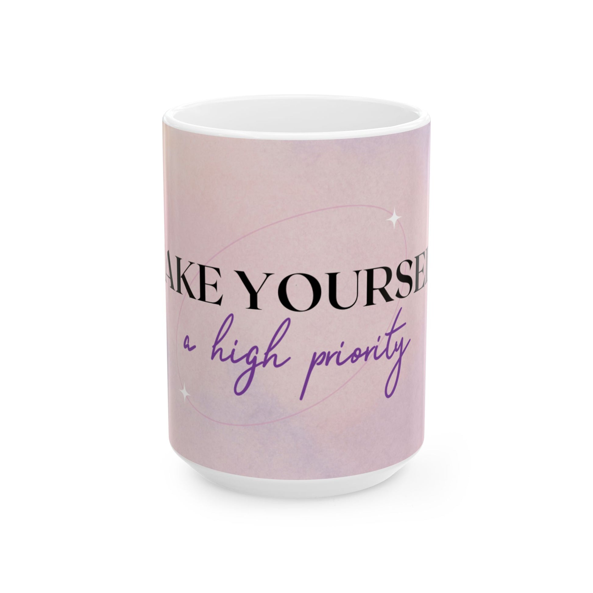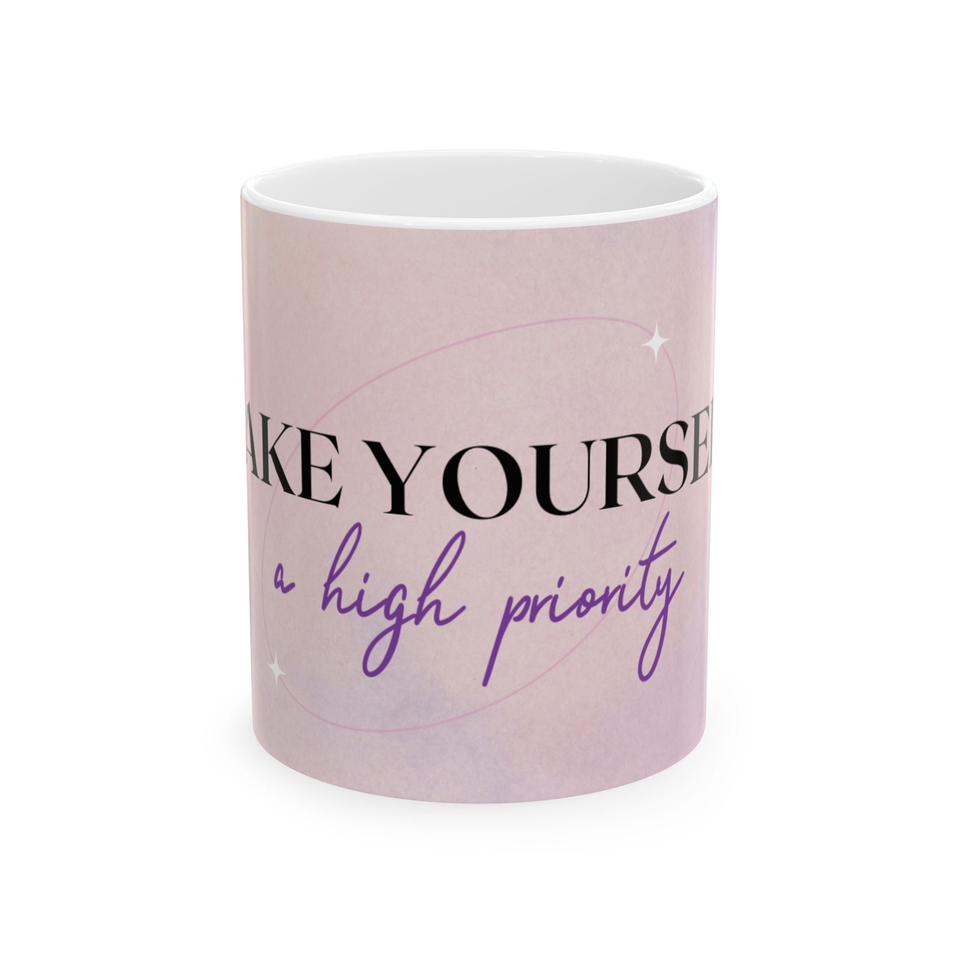 Motivational Ceramic Mug — "Make Yourself a High Priority" Pink Self-Care Coffee Cup (11oz/15oz)